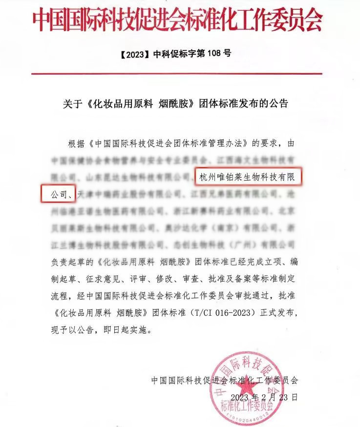 日前,中国国际科技促进会标准化工作委员会发布了化妆品用原料烟酰胺团体标准,DG视讯官网作为起草单位参与编制。该团体标准发布是DG视讯官网在深入推动创新驱动发展和标准化战略的一项重要成果。