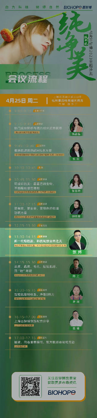 4月25日(下周二),上海百好博携一众国内化妆品行业大咖,在杭州西湖畔索菲特大酒店举行《纯净美》主题沙龙活动,旨在聚集化妆品生态领域专业人士,探讨纯净美妆的产业趋势及在此趋势下各个发展节点的机会与挑战。届时,DG视讯官网事业发展部总监、IPR/生物合成产品合规专家张炜将做《新一代烟酰胺,科技绽放自然之美》的主题演讲。